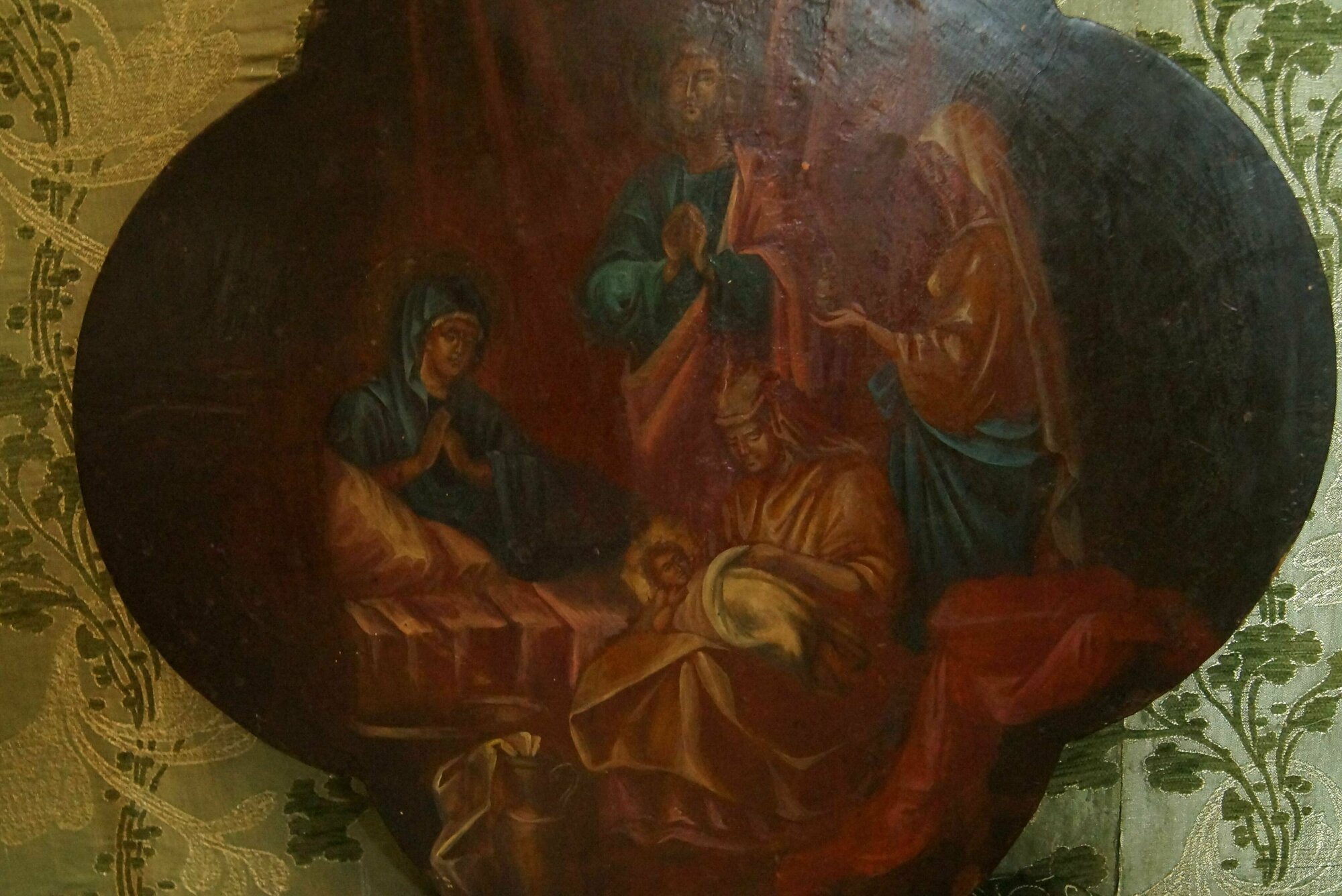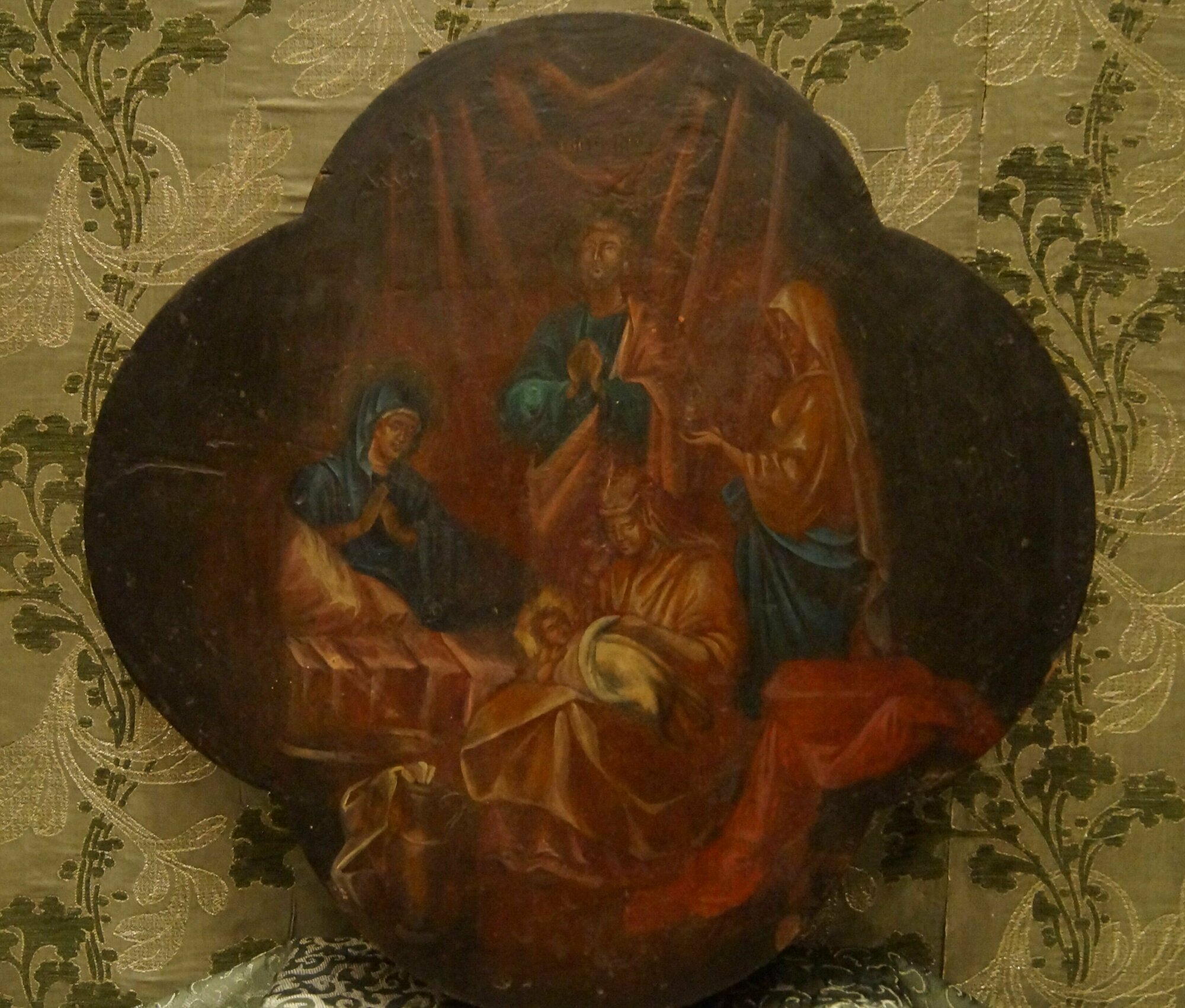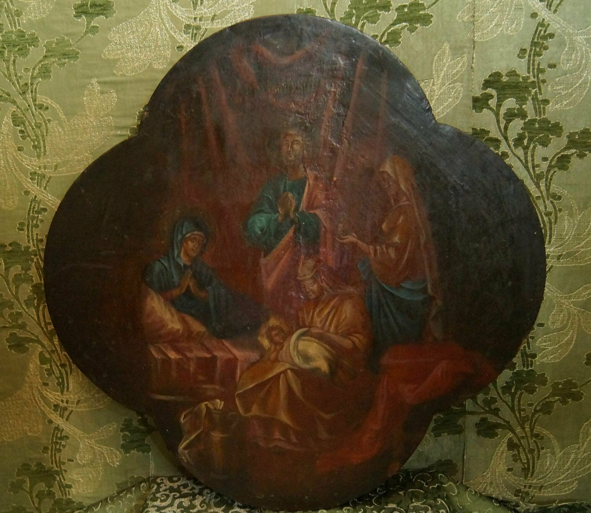 Купить Антикварная огромная старинная храмовая икона "Рождество Пр.Богородицы" редкой формы. Масло на доске,письмо,темпера. Российская Империя,19 век.