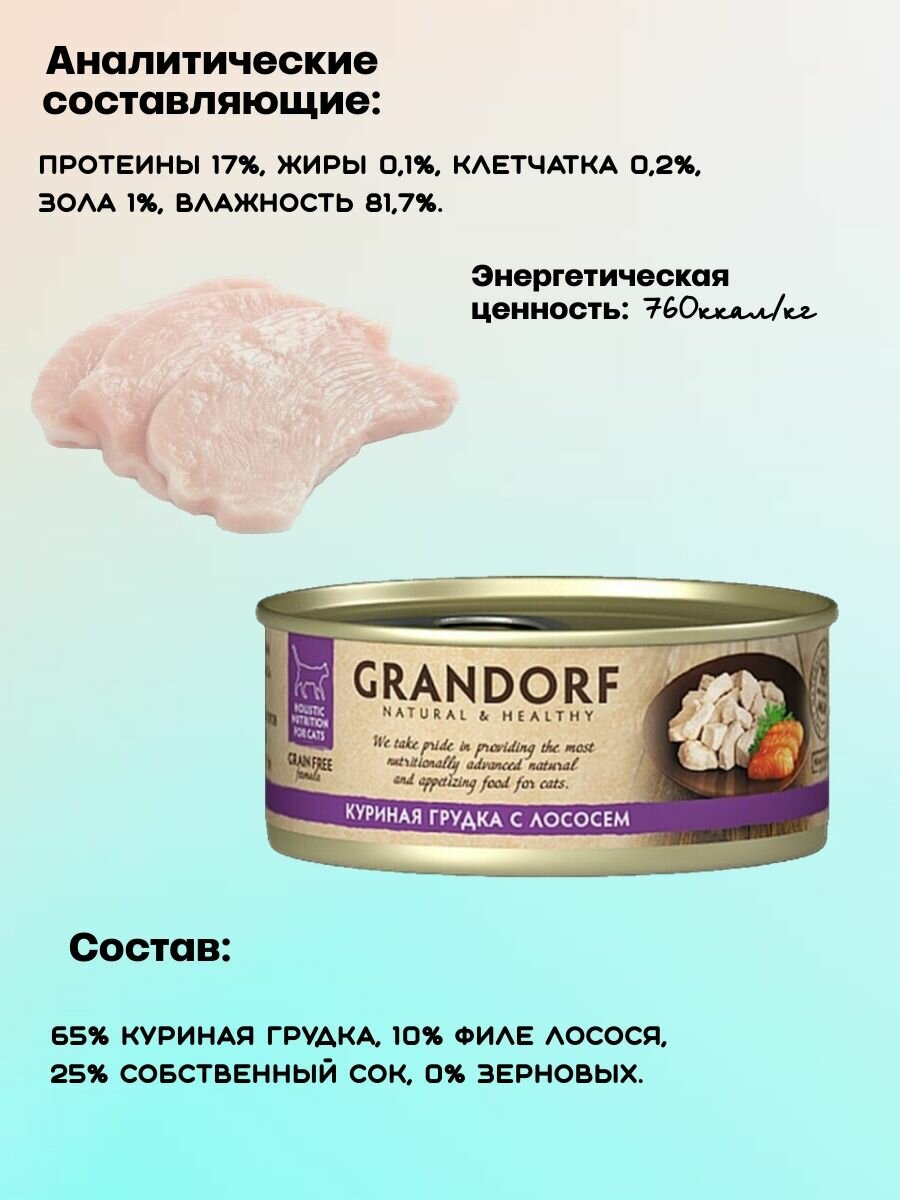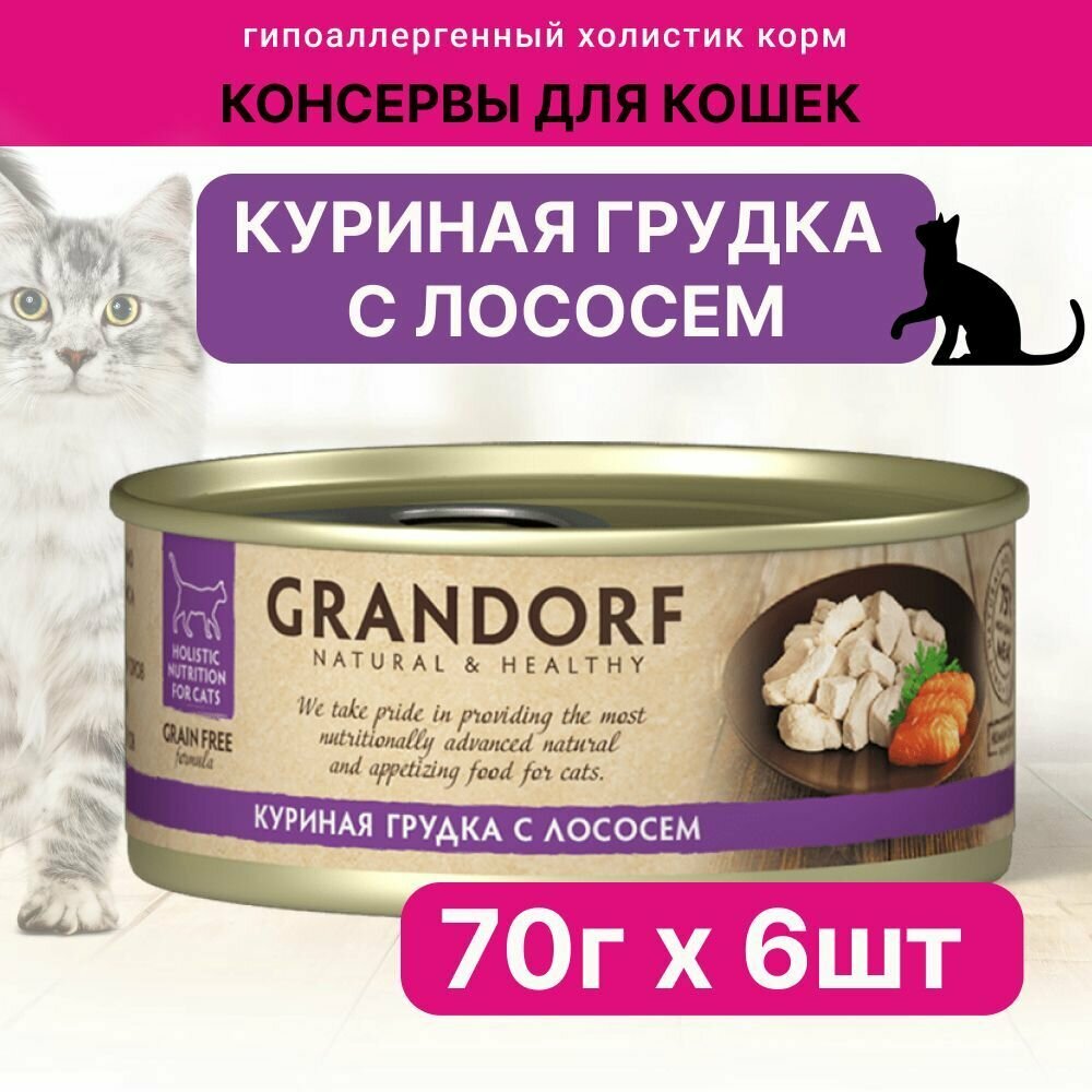 Влажный корм для кошек GRANDORF консервы куриная грудка с лососем 70г (6 штук)
