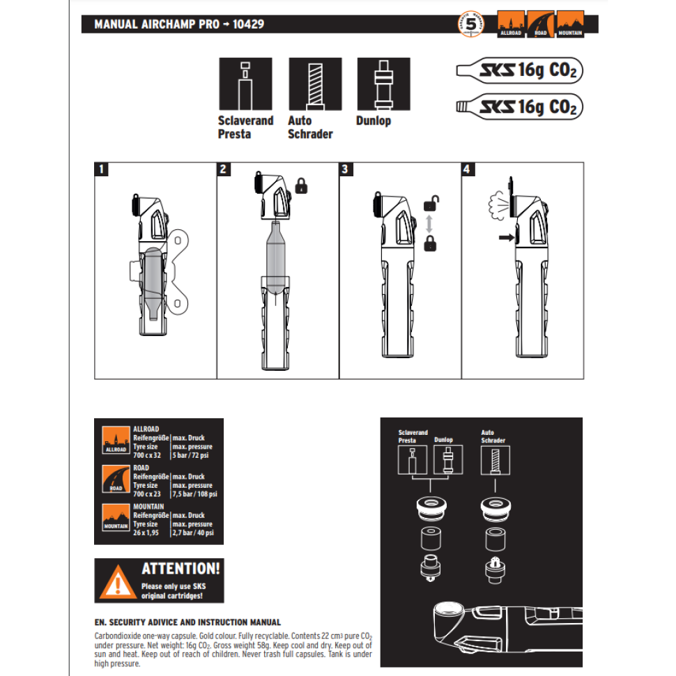 Насос мини SKS Airchamp Pro CO2, под ниппель: av (schrader), sv (presta), dv(dunlop), вес: 135 гр., работает от баллончика с сжатым газом