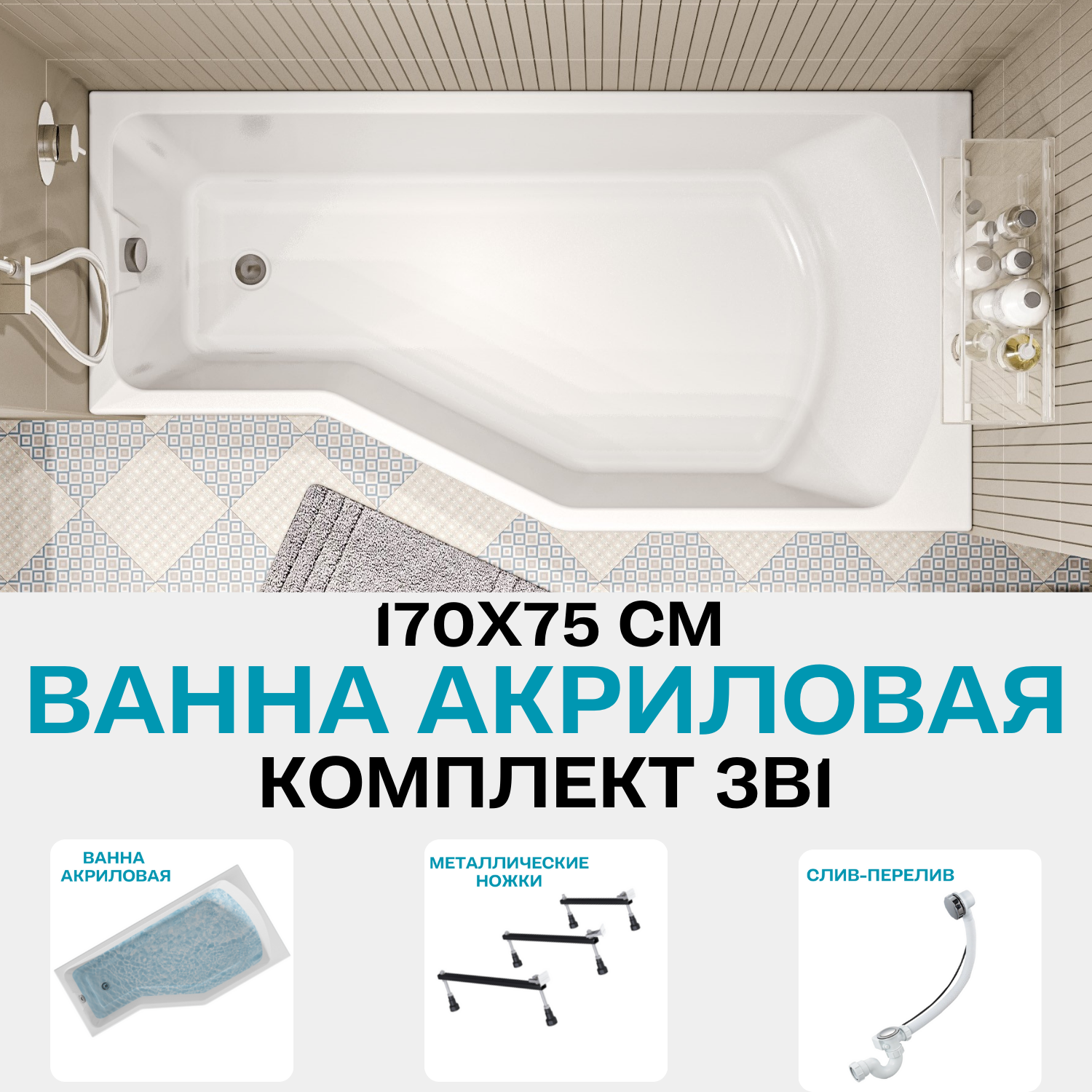 Купить Ванна акриловая 170х75 см 1MARKA Convey в наборе 3 в 1: Асимметричная ванна правый угол, металлические ножки, слив-перелив хром 01кон1775пкс2+