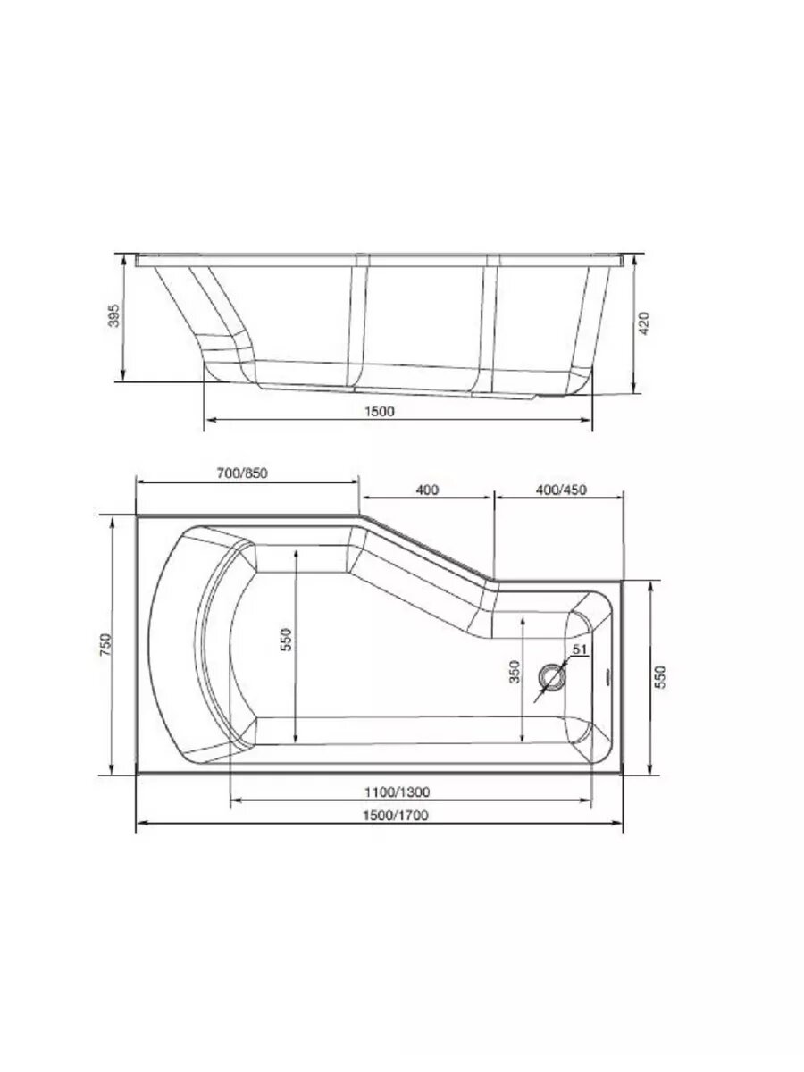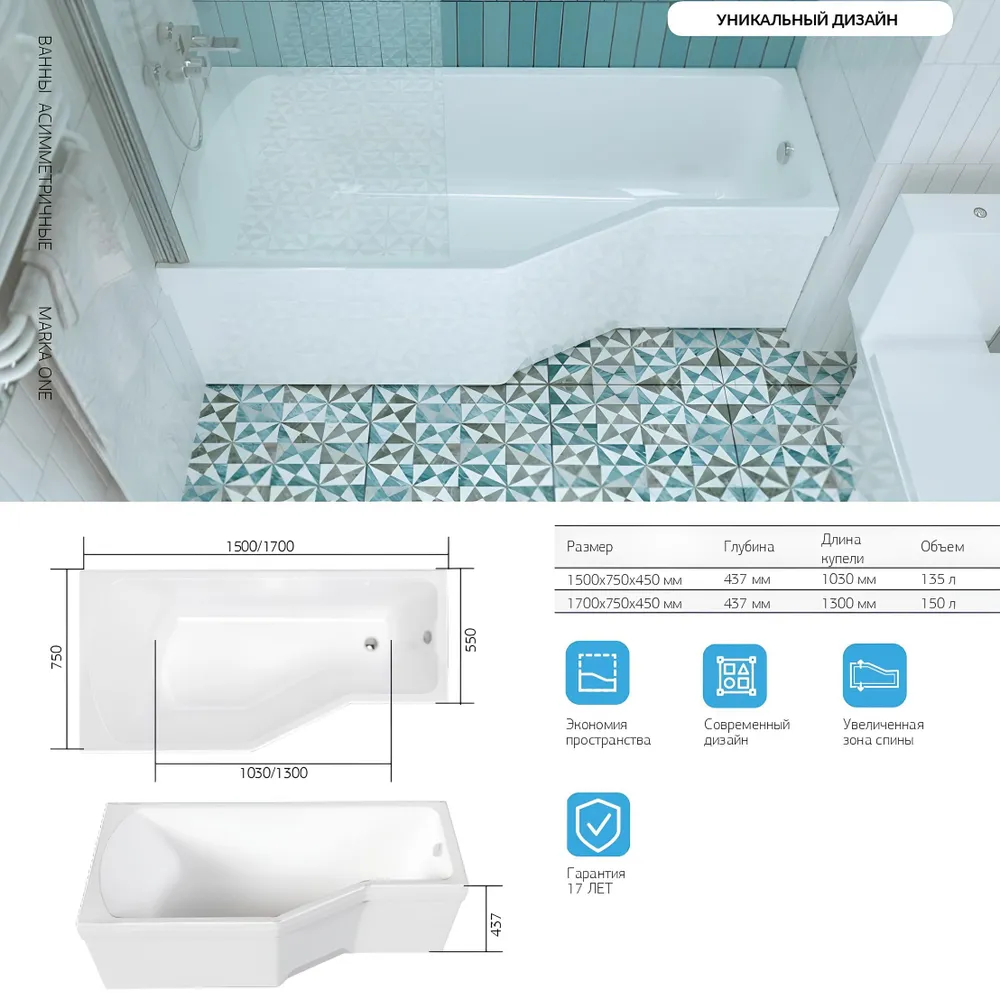 | Плюсы: | форма позволяет компактнее разместить мебель в ванной комнате, скошенная поверхность бортика в широкой части. |