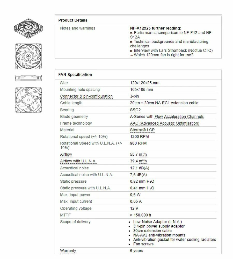 | Отзыв: | Будьте внимательны, 10-сантиметровый удлинитель №3 в комплекте -- это "Low-Noise Adaptor", который (как написано на сайте производителя) уменьшает максимальную скорость с 2000 до 1700 об/мин. |