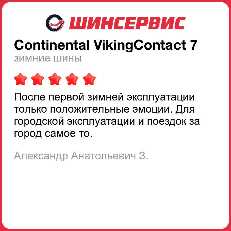 | Отзыв: | Резина впечатляет. После шипов, реально впечатляет. Первые дни ездил прямо с восторгом. Ощущения от вождения кардинально другие. Вообще пересел на Continental VikingContact 7 225/45 R17 я с обычной шипованной Gislaved NF 100 размерностью 205/55 R16 (до нее катался на Continental ContiIceContact). Разница с первых метров. Во первых больше никаких звуков пробуксовки(про вой и гул на скорости я вообще молчу, его нет), стартуем с места - тишина. Ускоряемся на скорости (антибукс работает) все равно тишина. Оттормаживаемся - тишина. После шипов даже немного теряешься, непонятно вообще как сравнить зацеп, стал он лучше / хуже. Второй момент это мягкость - я перешел с 55 на 45 профиль и когда поехал по неровностям я просто не поверил ощущениям, что новый Контик на 45 профиле едет гораздо мягче. А учитывая что 45 профиль дает заметно меньшие крены, чем 55, езда стала еще более комфортнее. Блин этот Континенталь просто обволакивает дорогу, 45 вроде бы довольно тонкий, а как плавно идет удивительно. Совокупность этих качеств дает ощущение, что авто стал на 2 класса выше.