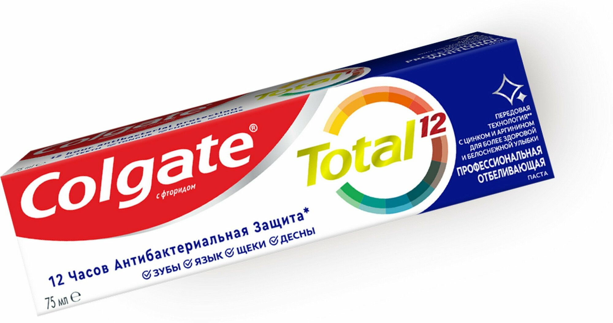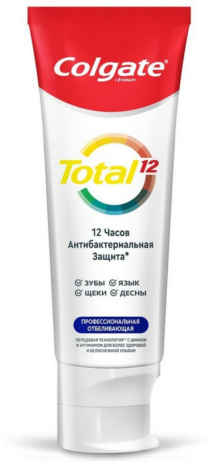Зубная паста COLGATE Total 12 Профессиональная Отбеливающая с цинком и аргинином для борьбы с потемнениями эмали и с антибактериальной защитой, 75мл