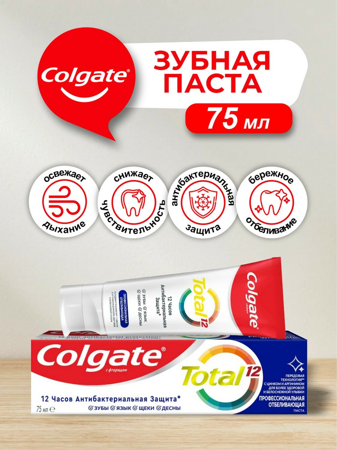 Colgate Зубная паста Total 12 Профессиональная Отбеливающая комплексная антибактериальная, 75 мл - 1 шт