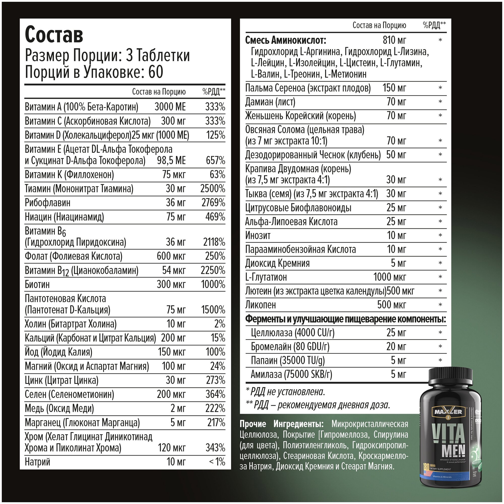 Фирма:Maxler Тип:Витамины. Описание: Созданный специально для мужчин комплекс ключевых минералов и экзотических фито-добавок VitaMen способствует улучшению умственной и физической активности, здоровью простаты, снижает негативные последствия стресса и нормализует функцию пищеварительной системы. Данный продукт снабжает ваш организм важными и быстро усваиваемыми аминокислотами, которые способствуют росту мышц. VitaMen содержит все, что вам необходимо для достижения максимальных результатов! Принимать: VitaMen по 3 табл. / день одновременно, или равномерно распределяю после основных приемов пищи. Ограничения традиционно касаются несовершеннолетних, кормящих и беременных. Превышение дозы не улучшит результат, а может привести к ухудшению. В связи с этим категорически запрещено превышать дозировку. Перед использованием проконсультируйтесь у врача. Хранить в недоступном от детей месте. СОСТАВ 1 порция витаминов VitaMen (3 капсулы) содержит: Цинк - 0,015 гр. Йод - 0,15 гр. Кальций - 0,35 гр. Магний - 0,20 гр. Хром - 0,12 гр. Селен - 0,1 мг. Медь - 2 мг. Биотин - 0,10 мг. Фол. кислота - 0,4 мг. Тиамин - 0,05 гр. Витамины: С - 0,25 гр. Е - 200 МЕ А - 5 000 МЕ К - 0,08 мг. D - 400 МЕ В12 - 0,1 мг. В6 - 0,01 гр. Продукт не является лекарственным средством. Не рекомендуем использовать продукцию лицам, не достигшим 18 лет. Перед началом приема любого продукта обязательно проконсультируйтесь у специалиста! |