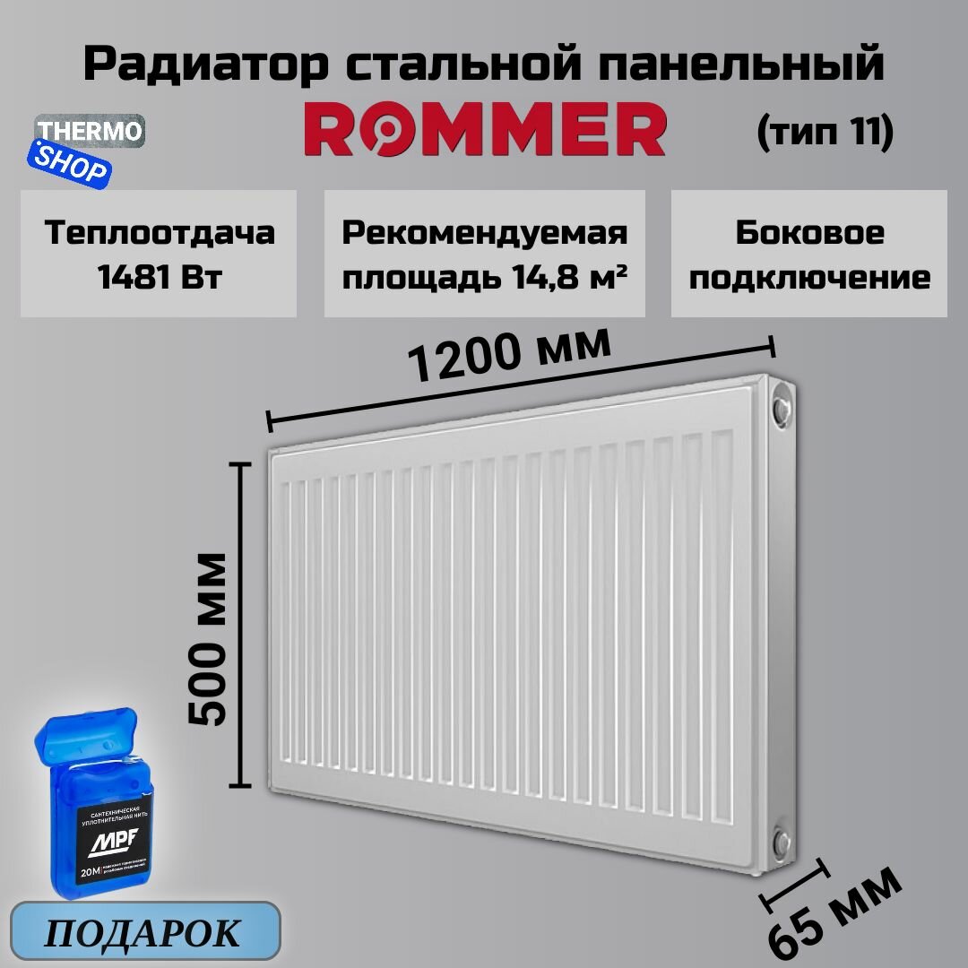 Радиатор стальной панельный ROMMER 500х1200 боковое подключение Compact 11/500/1200 Нить сантехническая