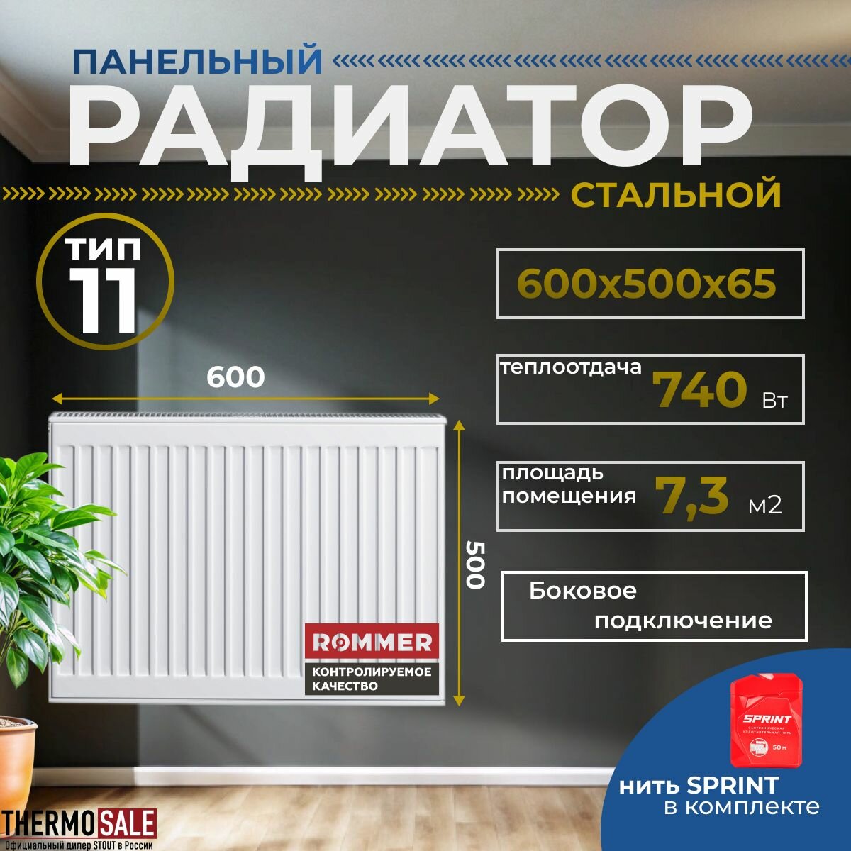 Радиатор стальной панельный ROMMER 500х1200 боковое подключение Compact 11/500/1200 Нить сантехническая