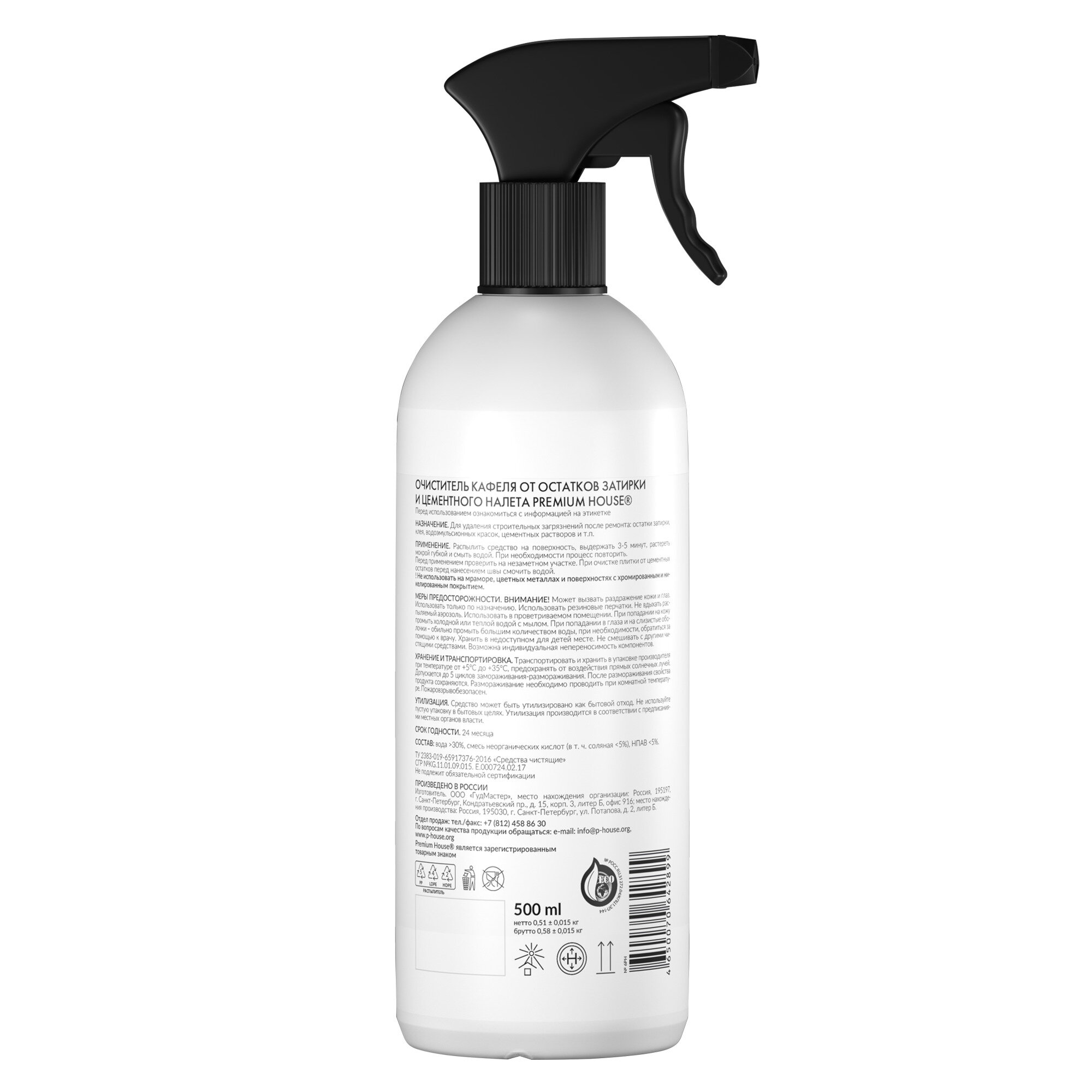 Очиститель кафеля от остатков затирки и цементного налета PREMIUM HOUSE PH-очист/каф-0,5