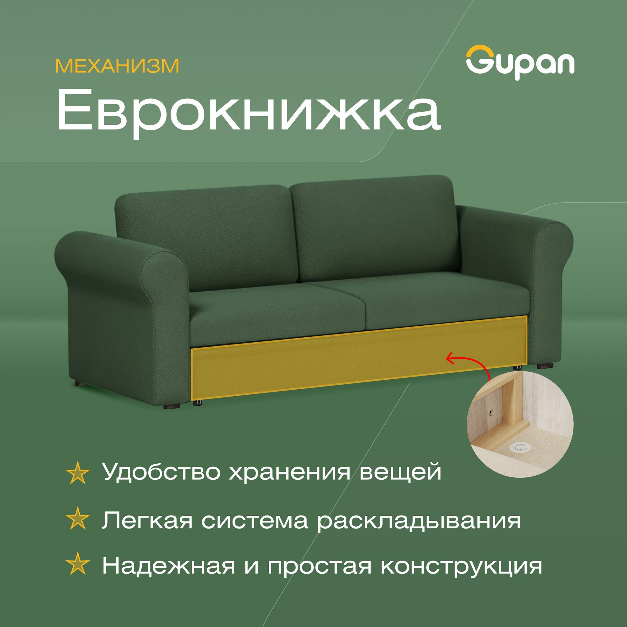 Купить Диван кровать Gupan Римини Велюр Amigo Green, раскладной, механизм еврокнижка, беспружинный, с ящиком для белья