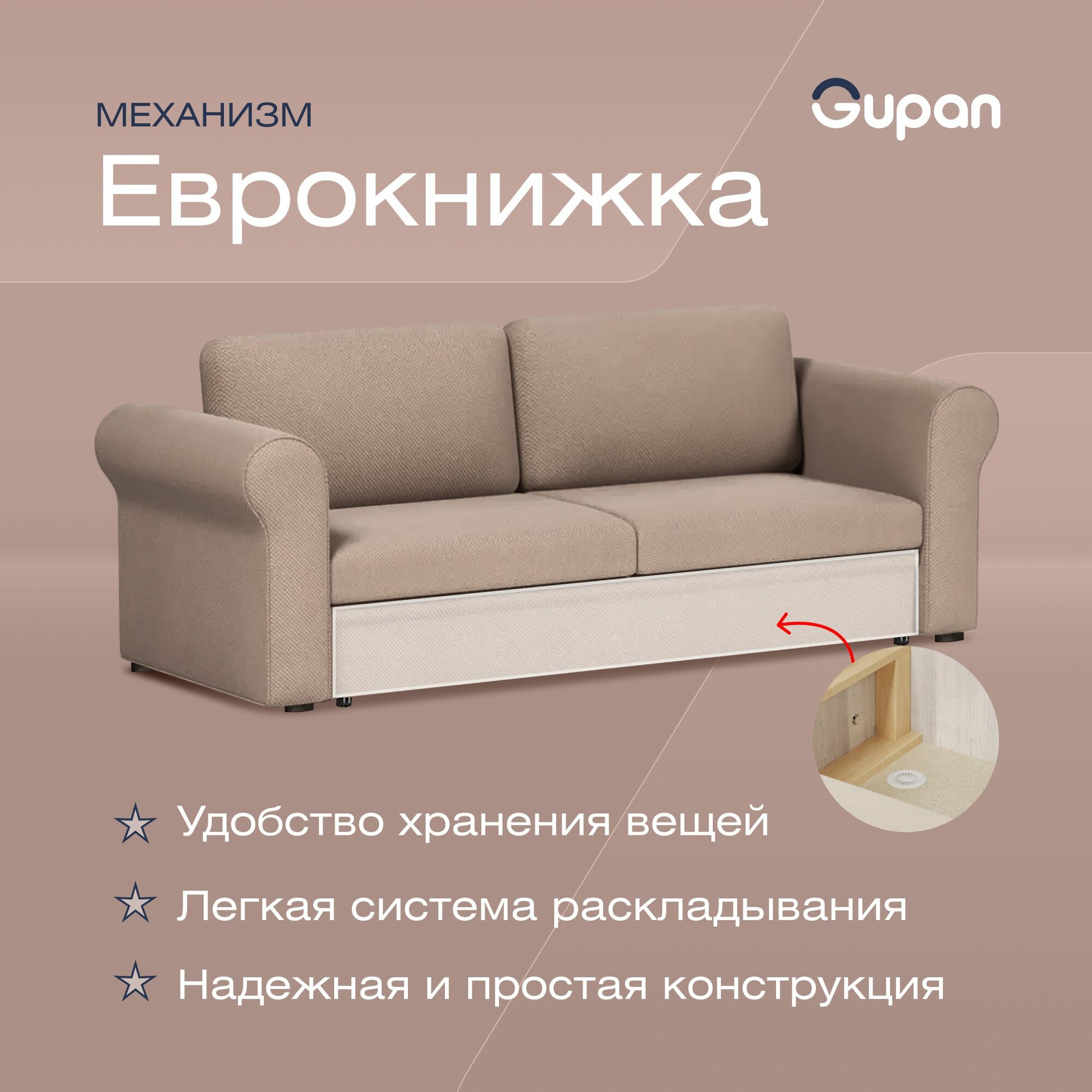 Диван кровать Gupan Римини Велюр Amigo Beige, раскладной, механизм еврокнижка, беспружинный, с ящиком для белья
