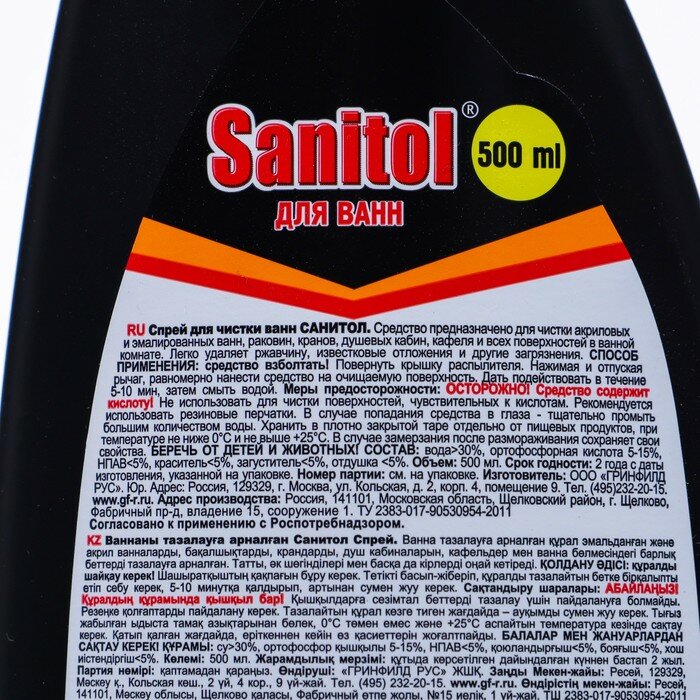 Sanitol / Средство для чистки акриловых, эмалированных ванн , с распылителем , 500 МЛ.
