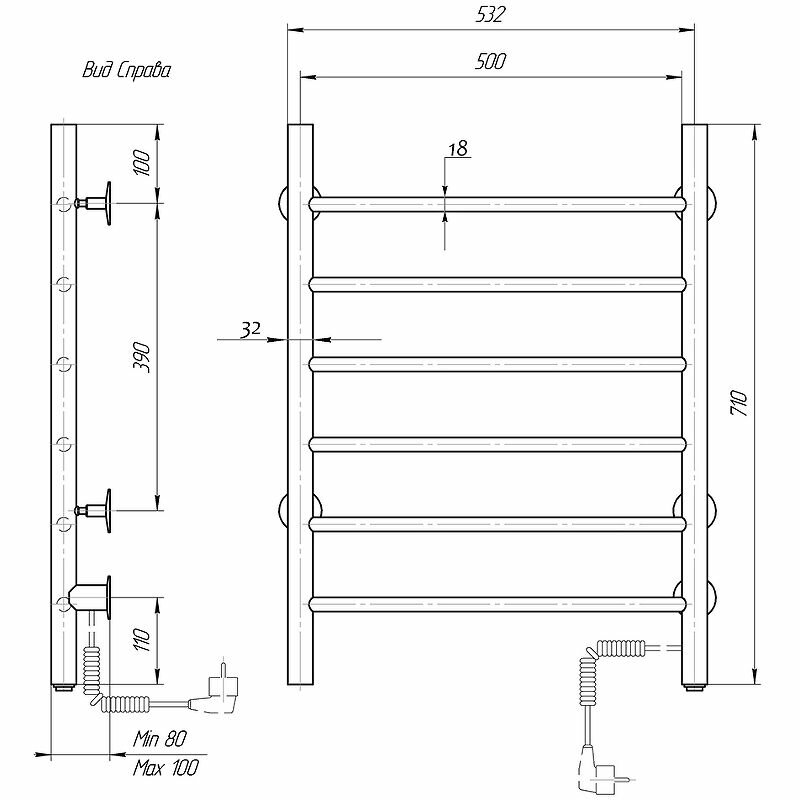 Полотенцесушитель электрический Domoterm Аврора DMT 109-6 50х71 EK R подключение справа, витой провод