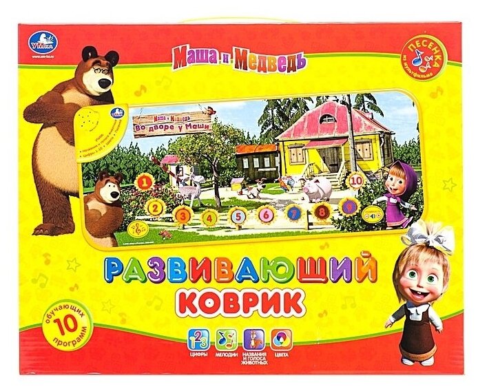 Цифровой блок хорошо подходит для изучения цифр (озвучивается голосом Маши). Также названий цветов много в коврике, которые Маша озвучивает (при повторном нажатии на цифры). При нажатии на зверей Маша озвучивает сначала самого зверя, а при повторном нажатии, - звуки издаваемые зверями. |