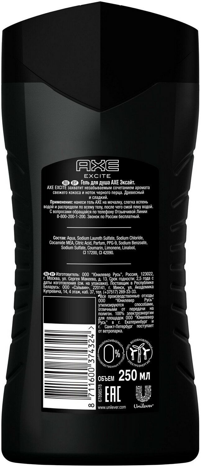 Гель для душа Axe Excite Эксайт Кокос и Черный перец for men для мужчин 250мл