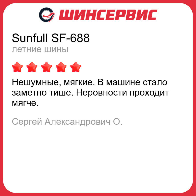 Ниже Вы можете прочитать отзывы на Sunfull SF-688 205/65 R16 H95, ознакомится с подробными характеристиками, посмотреть интересные обзоры и фотографии на Sunfull SF-688 205/65 R16 H95.