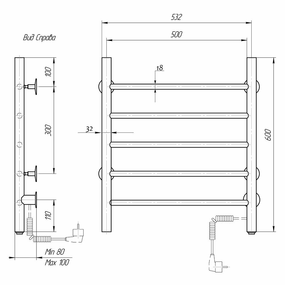 Полотенцесушитель электрический Domoterm Аврора DMT 109-5 50х60 EK R подключение справа, витой провод