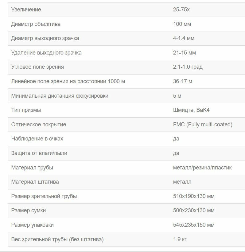 | Плюсы: | Стальная труба , заполнена газом , выдвижные наглазник , 25-75 крат , диаметр 100 мм. |