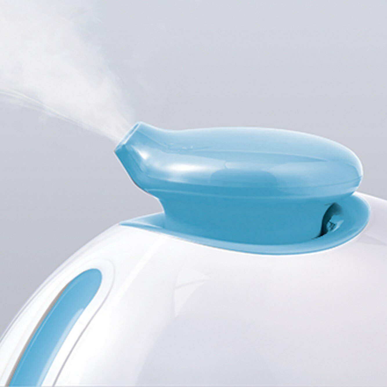 Нравится дизайн, купили увлажнитель в бело-голубой расцветке. Удобно, что распылитель поворотный, и я могу направить поток пара в любую сторону. Сбоку находится окно-индикатор, через который видно, сколько еще в увлажнителе осталось воды. Как только вода заканчивается, он отключается.