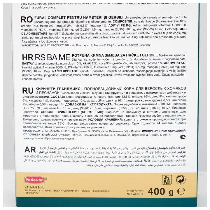 Padovan Корм сухой для хомяков и песчанок Grandmix Criceti-Gerbilli 400г