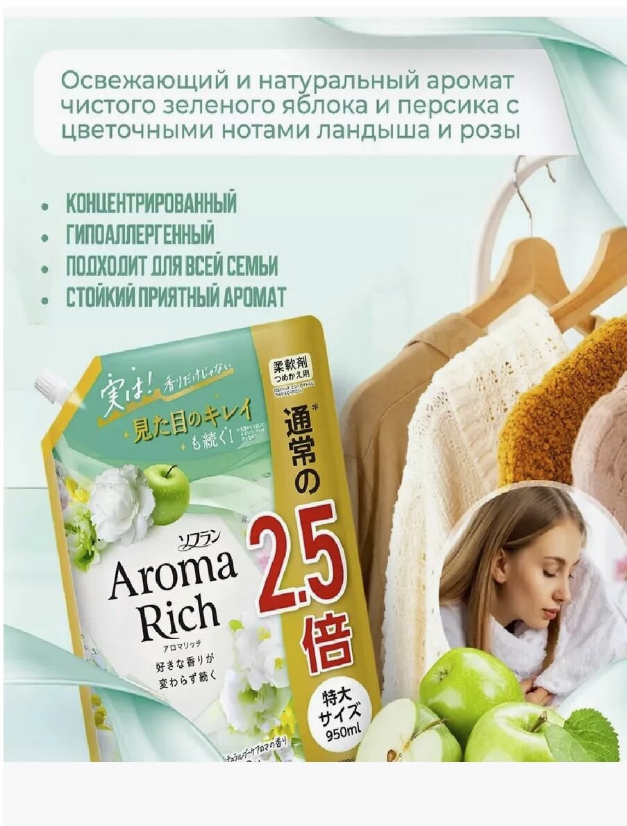 LION Кондиционер для белья Soflan Aroma Rich Ellie Премиум кондиционер-ополаскиватель для белья c натуральными маслами цветущей яблони и жасмина, освежающими нотками полевого лютика, ландыша и белого пиона, сменная упаковка 400 мл