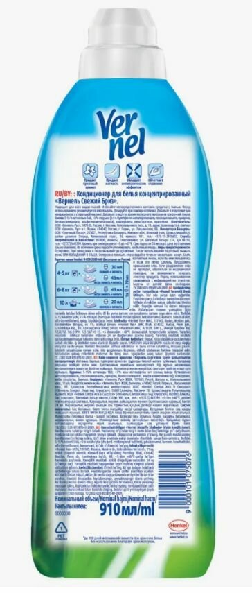 Купить Концентрированный кондиционер ополаскиватель для стирки белья Вернель Свежий бриз, 0,910 л (34 стирки)