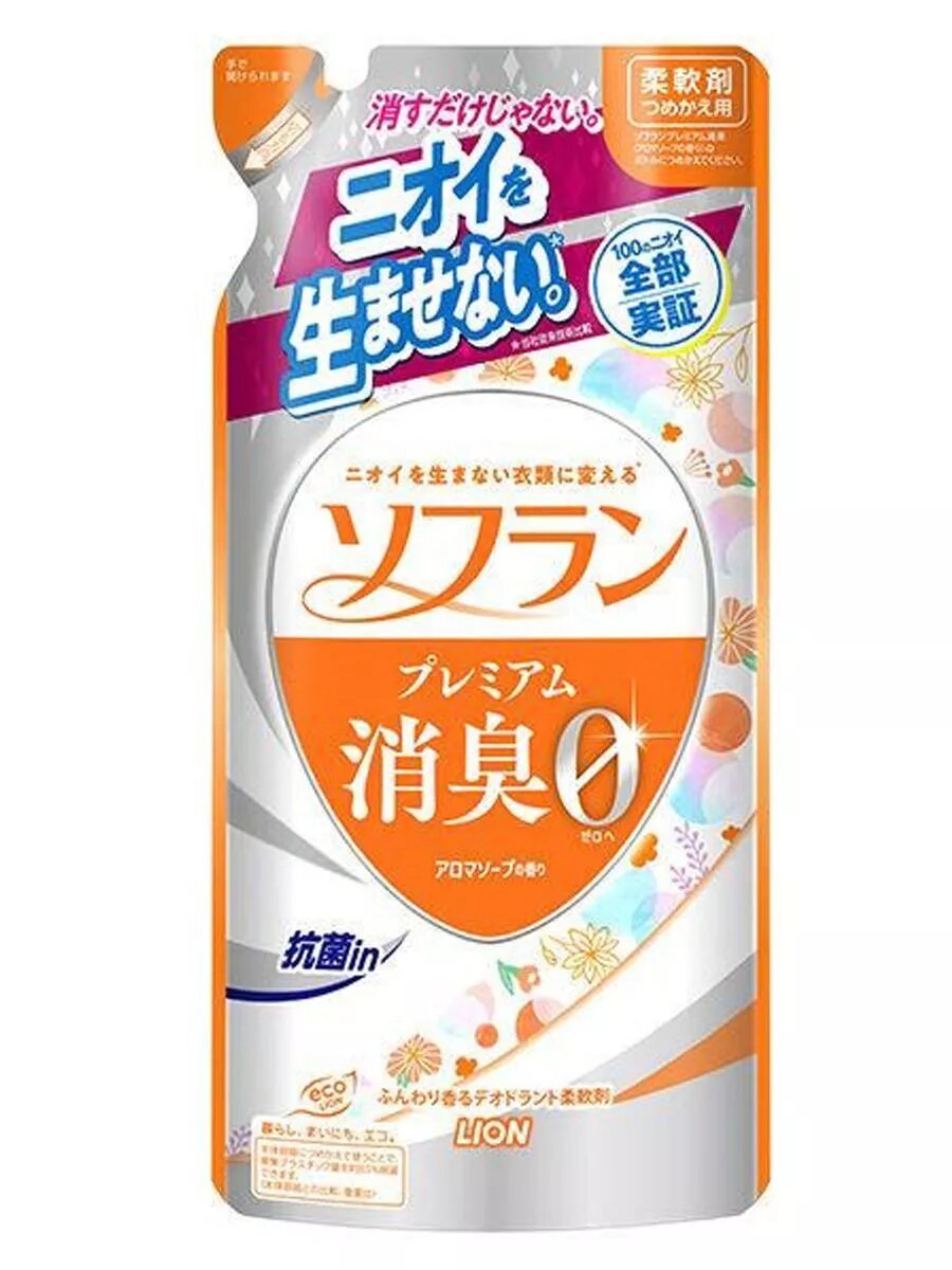 LION Кондиционер для белья "SOFLAN" (с мощным антибактериальным эффектом для защиты от неприятного запаха "Premium Deodorizer 204" - натуральный аромат цветочного мыла) 380 мл, мягкая упаковка