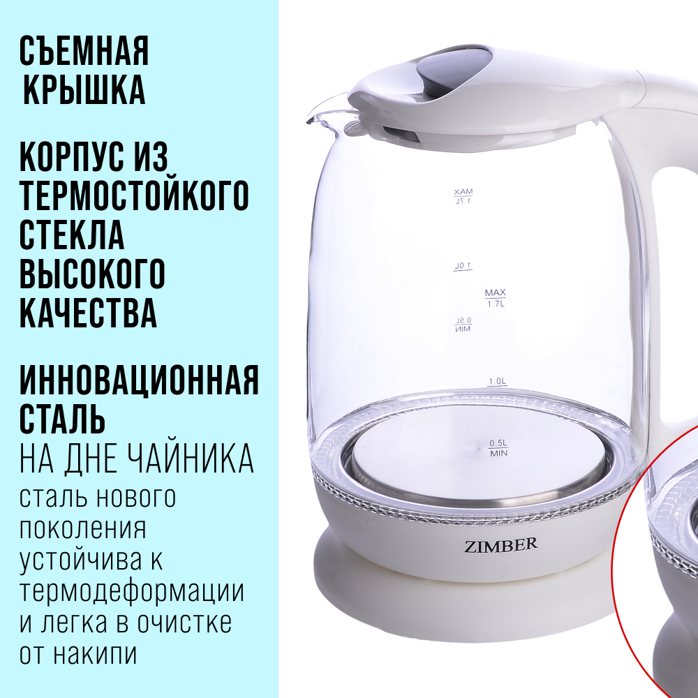 Купить Электрический чайник ZIMBER, 1,7л, стеклянный с подсветкой 11252