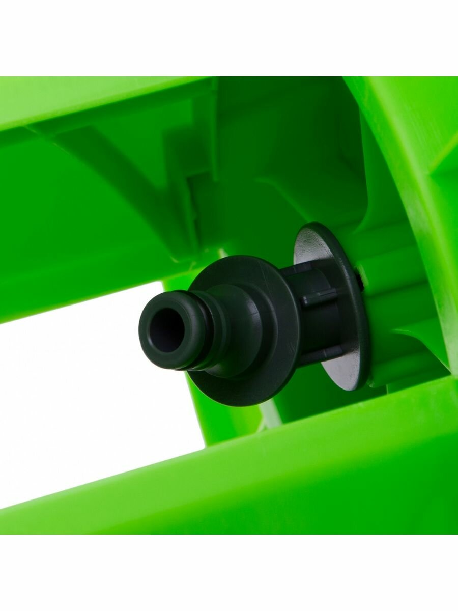 Высота ручки для взрослого человека высоковата Пластиковые колеса плохо передвигаются по неровной поверхности участка |