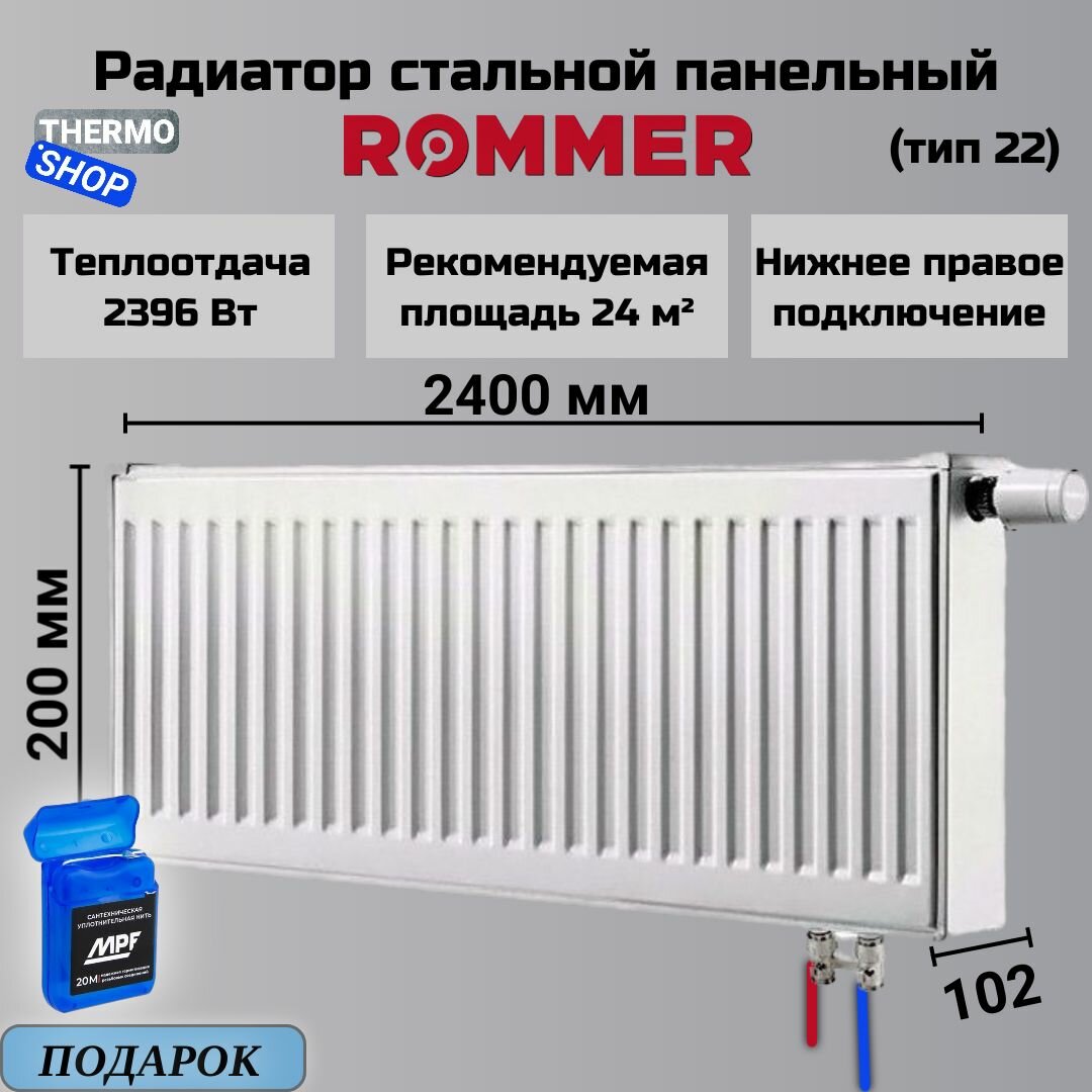 Радиатор стальной панельный ROMMER 200х2200 нижнее подключение Ventil 22/200/2200 Сантехническая нить
