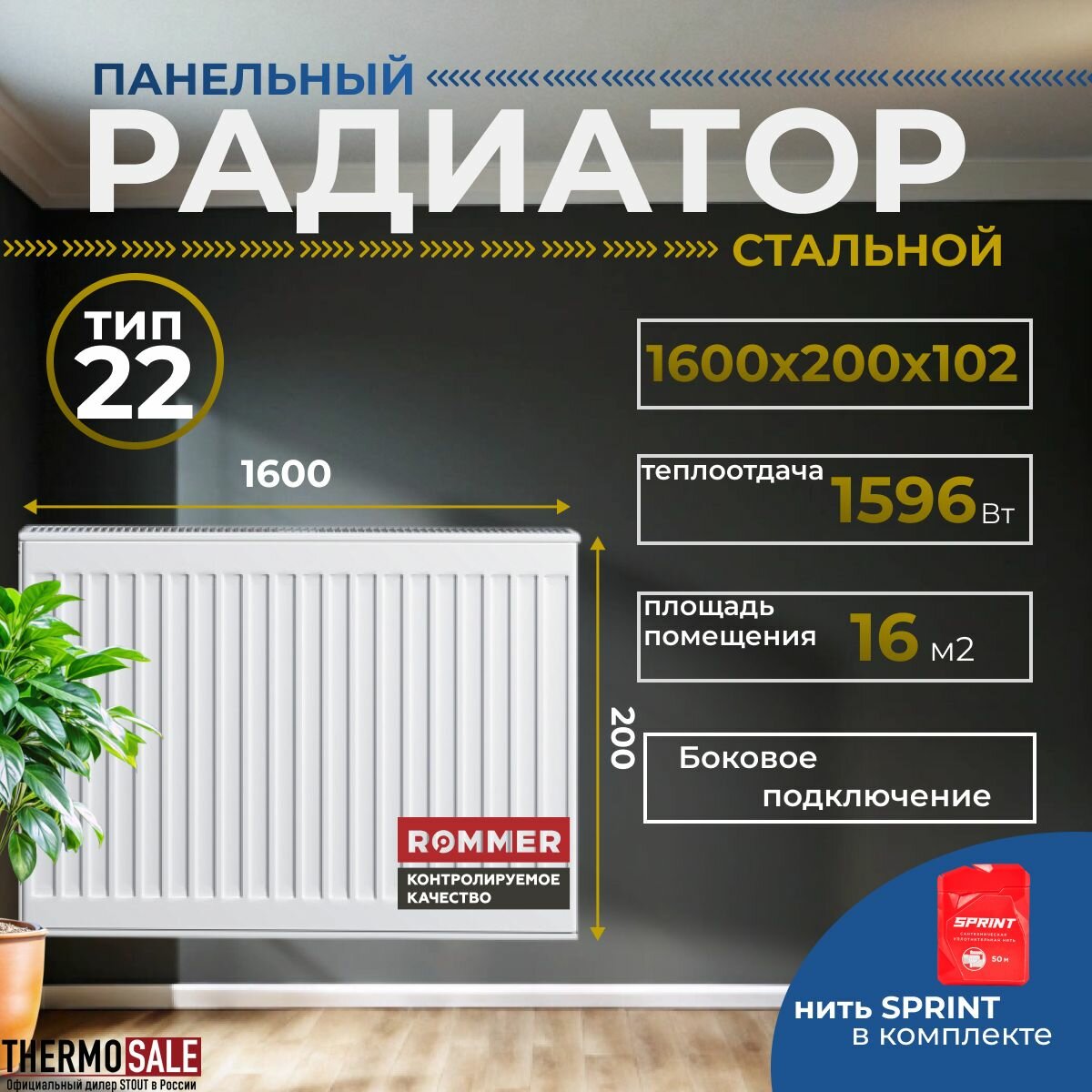Радиатор стальной панельный ROMMER 200х1600 боковое подключение Compact 22/200/1600 Нить сантехническая