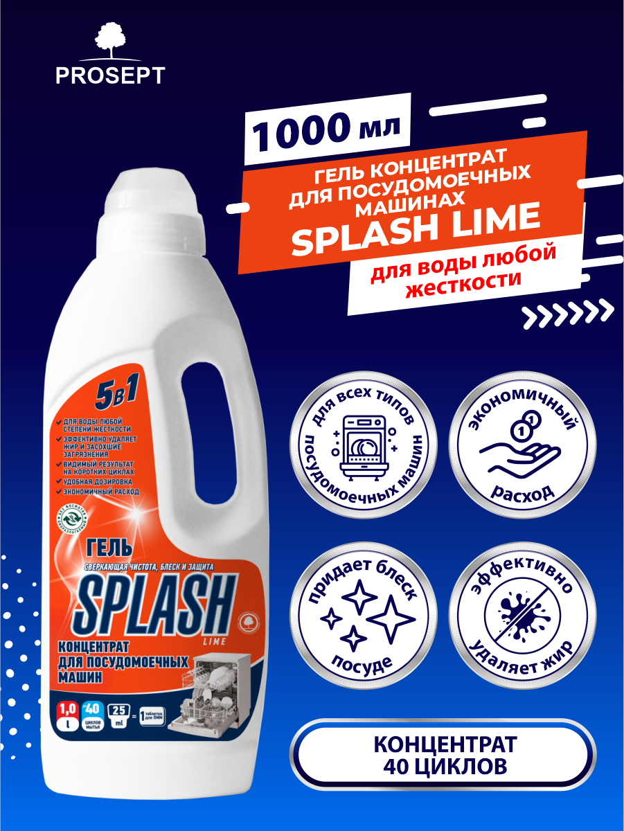 Prosept Splash Lime Гелеобразный концентрат для мытья посуды в посудомоечных машинах, для воды любой степени жесткости, 1 л