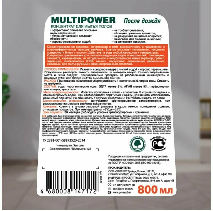 Средство для мытья полов Prosept Multipower "После дождя", концентрат, 800 мл