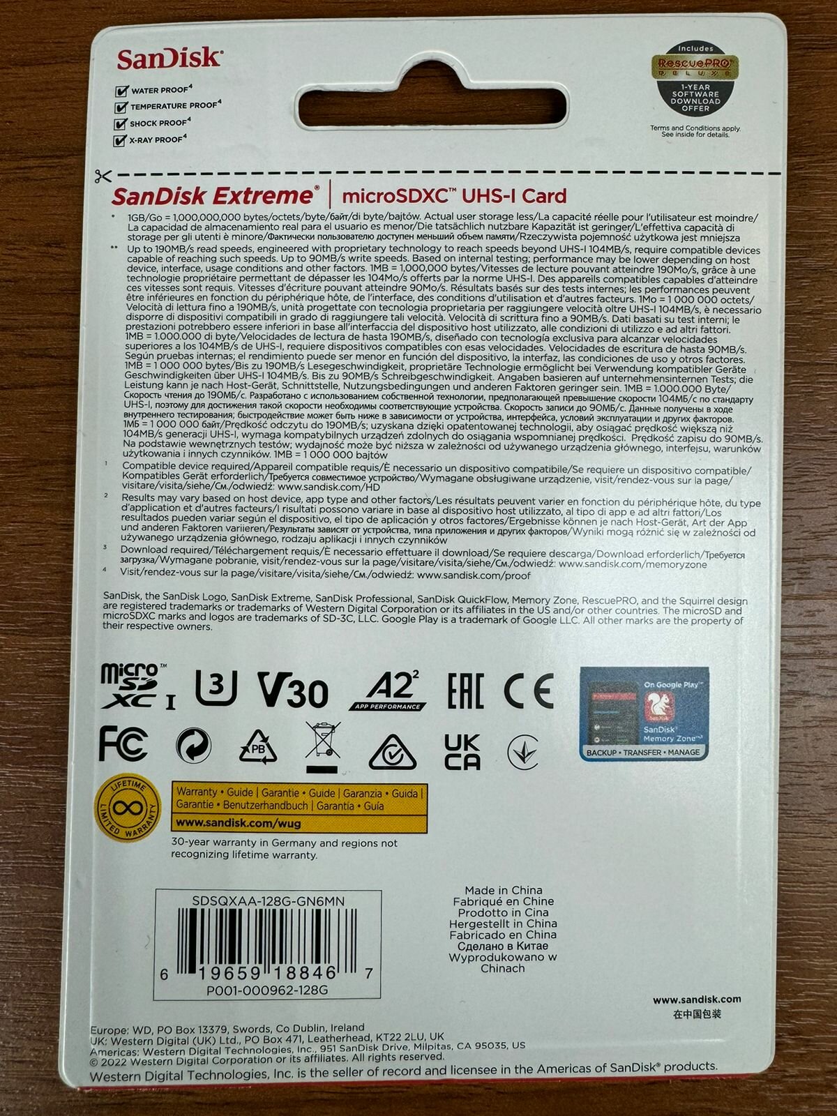Карта памяти SanDisk Extreme microSDXC 128 ГБ Class 10, V30, A2, UHS Class 3, R/W 190/90 МБ/с