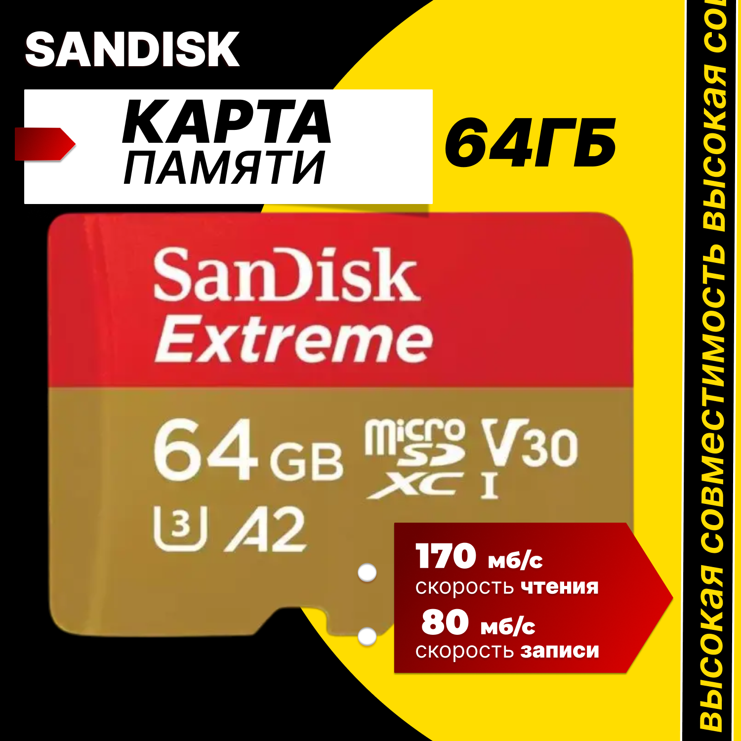 Оригинальная Карта памяти Sandisk MicroSDXC 64 Gb Extreme Class 10, UHS Class 3, UHS-I, V30, A2. 170/80Mb/s