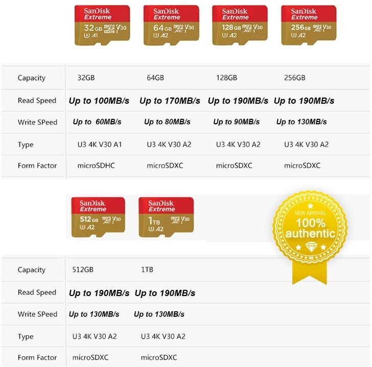 Micro SD 512GB SanDisk microSDXC Class 10 UHS-I A2 C10 V30 U3 Extreme 190MB/s SDSQXAV-512G-GN6MN