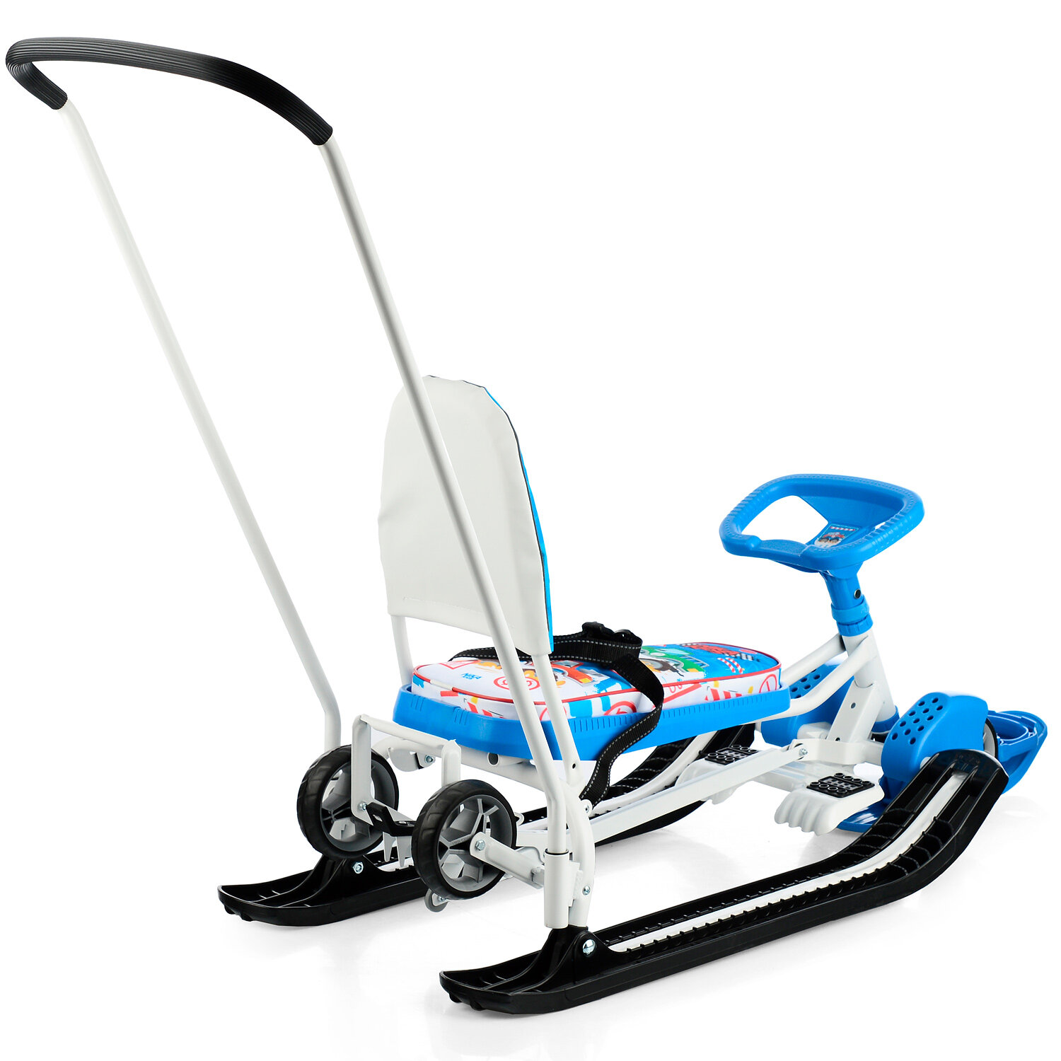 | Отзыв: | В целом аппарат не подвел: удобная спинка с нетрескующимся на морозе сиденьем, удобный руль (который, правда, не регулируется), возможность катать его на полозьях и колесах, наличие съемной ручки для родителей.