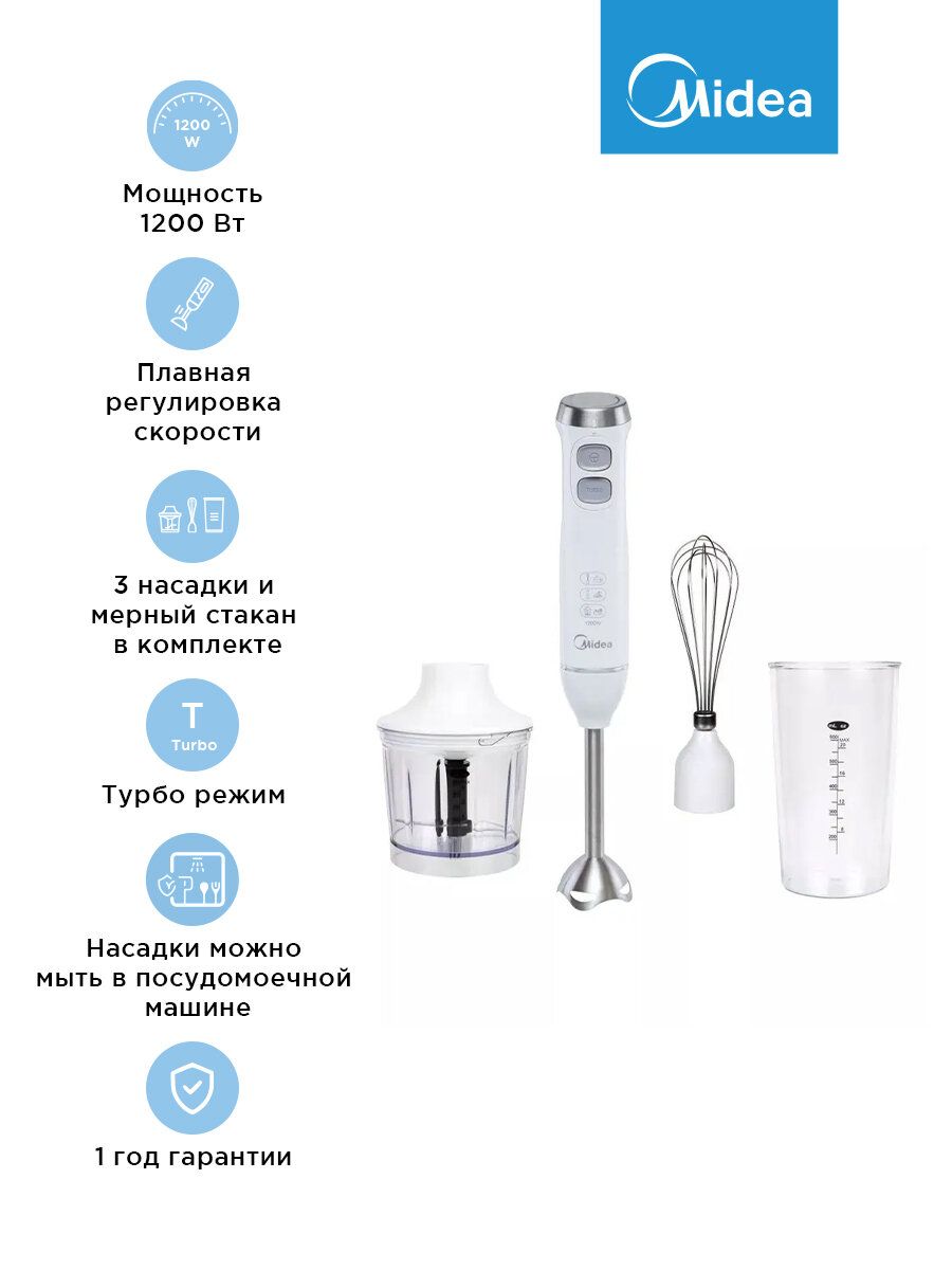 Купить Блендер погружной Midea MC-BL301, 1200 Вт, 4 в 1, чаша 0,5 л, 3 насадки, турборежим, белый
