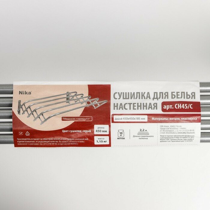 Сушилка настенная для белья(гармошка)6м(Д120*Ш45*В18,5см)серебро металл,max нагрузка=10кг,СН120/С Nika (арт. 759223)