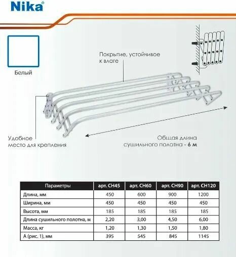 Сушилка для белья NIKA СН60 3м настенная складная металлическая белый цвет