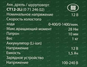 Дрель-шуруповерт аккумуляторная status ct12-2li 12 в. 1.3 а/ч. 2xli-ion