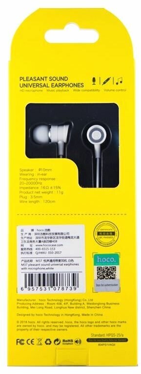 Наушники вкладыши с микрофоном Hoco M37 Pleasant (белые)