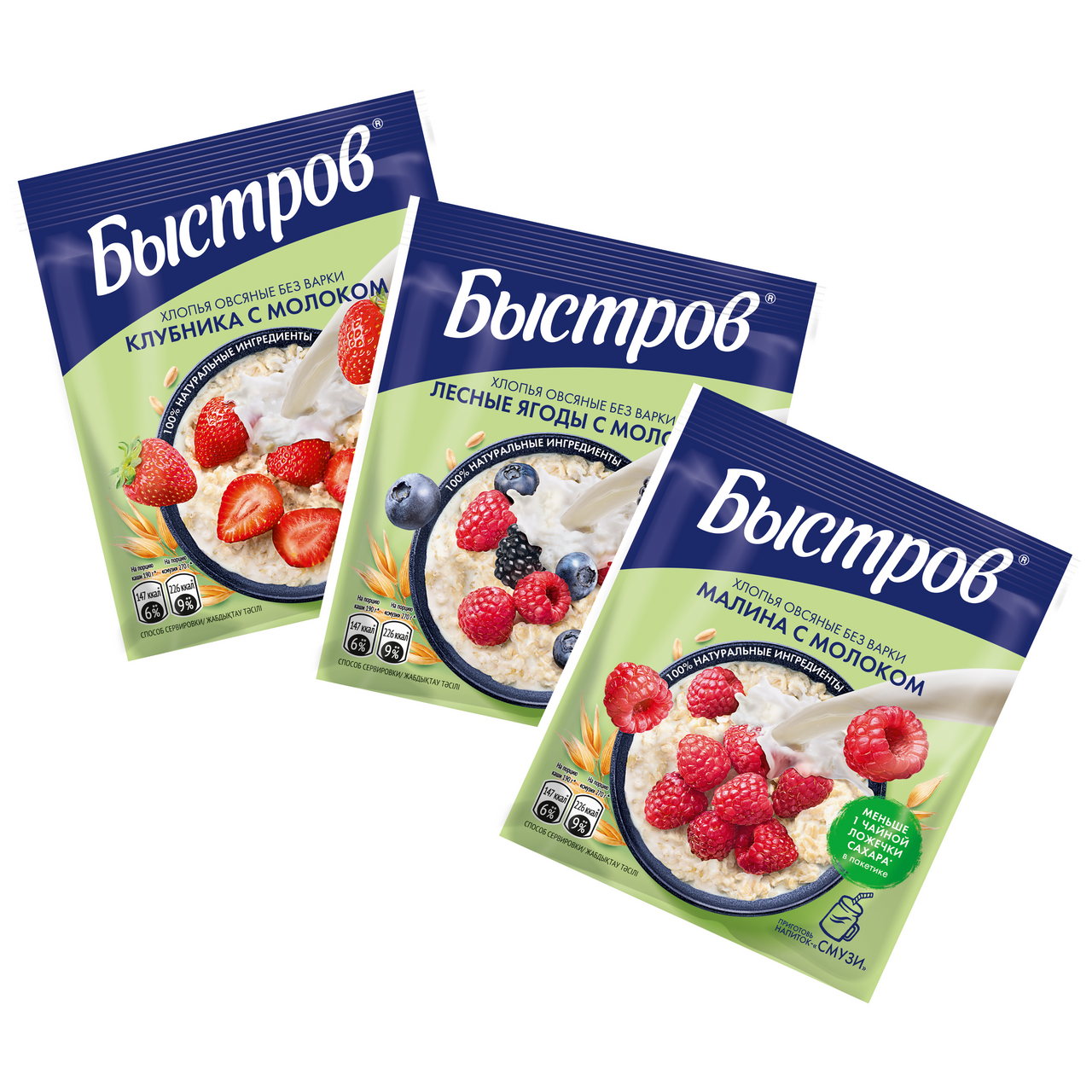 Быстров®. Ассорти. Каша овсяная, не требующая варки: с клубникой и молоком; с малиной и молоком; с лесными ягодами и молоком. 240г