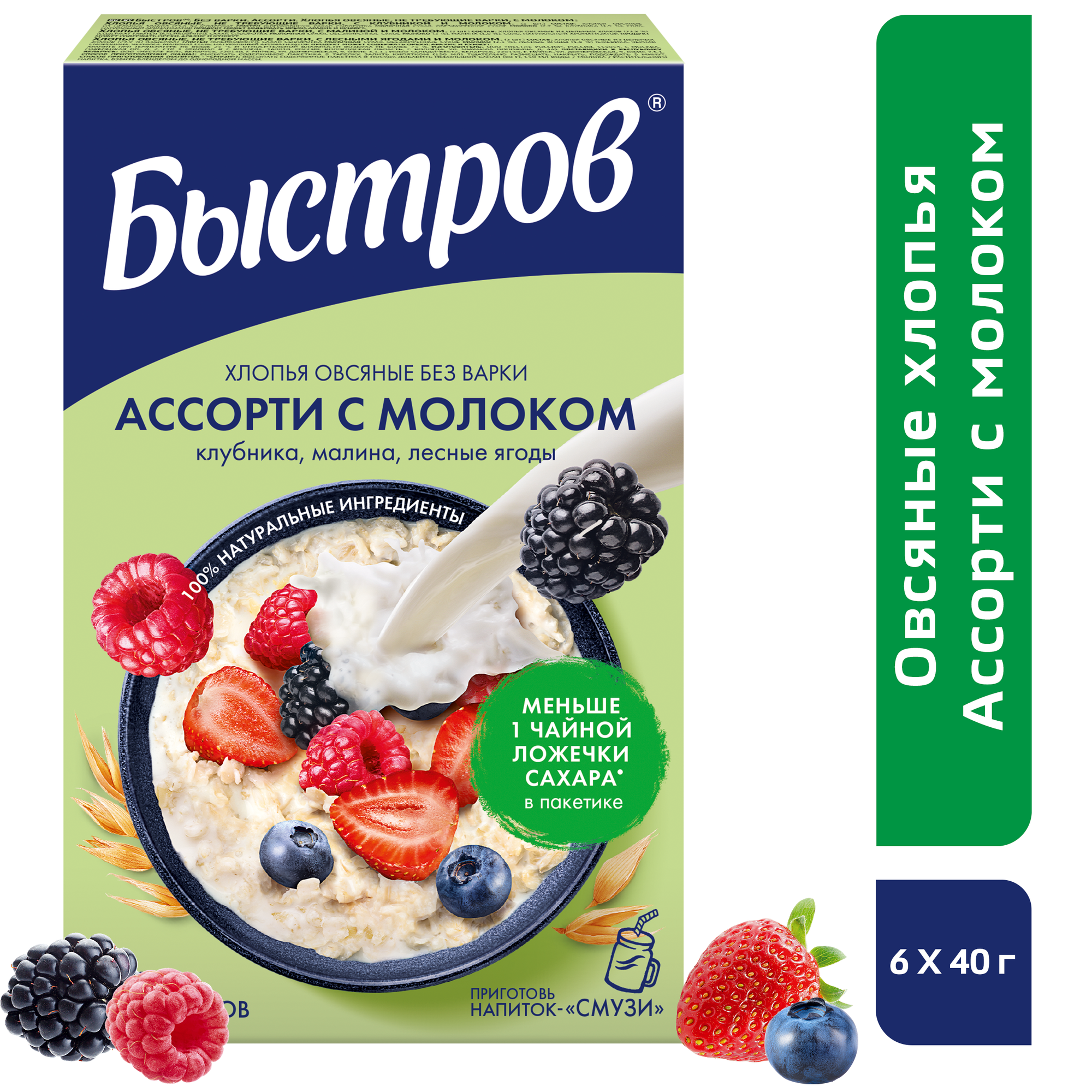 "Быстров" каша овсяная, не требующая варки, Ассорти с клубникой, малиной, лесными ягодами и молоком 240г 6шт