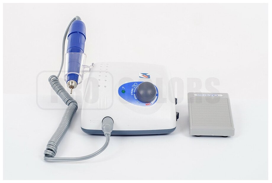 Аппарат для маникюра и педикюра Strong 210/105L с педалью в сумке, 35000 об/мин, 1 шт., белый/синий, 240 грит