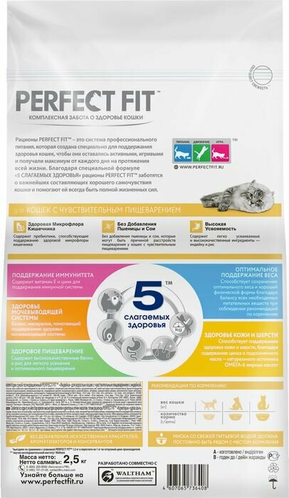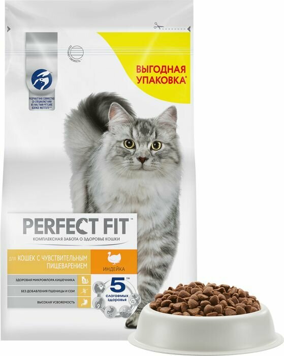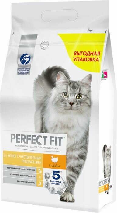Корм сухой для взрослых кошек PERFECT FIT с индейкой, с чувствительным пищеварением, полнорационный, 2,5кг