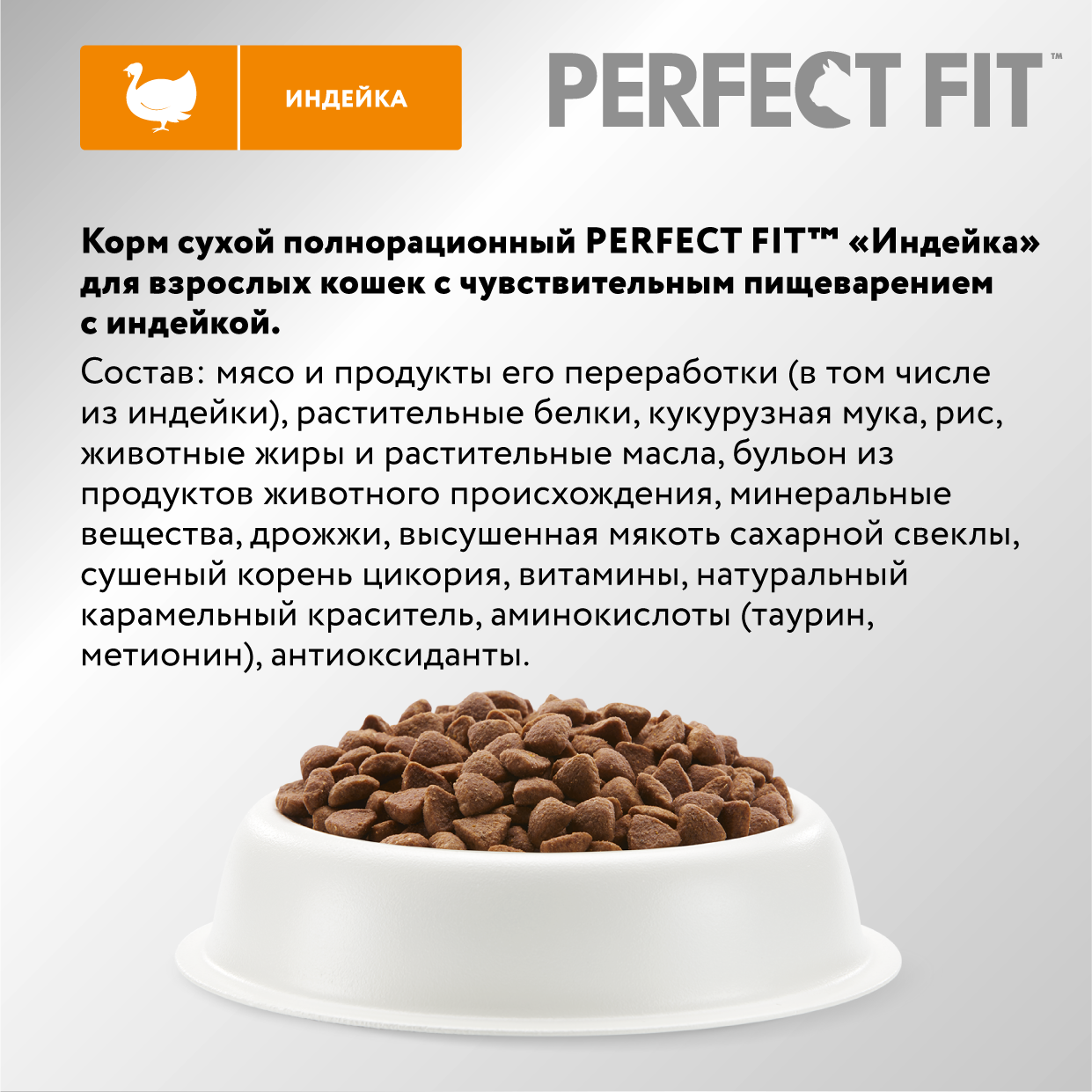 Корм сухой PERFECT FIT Корм сухой полнорационный для взрослых кошек с чувствительным пищеварением, с индейкой, 2.5кг