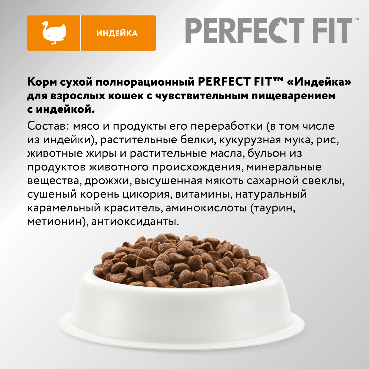 Корм сухой Perfect Fit полнорационный для взрослых кошек с чувствительным пищеварением, с индейкой, 1.2кг