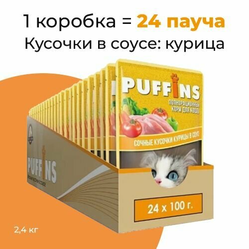 Влажный корм для кошек Puffins с курицей 24 шт. х 100 г (кусочки в соусе)