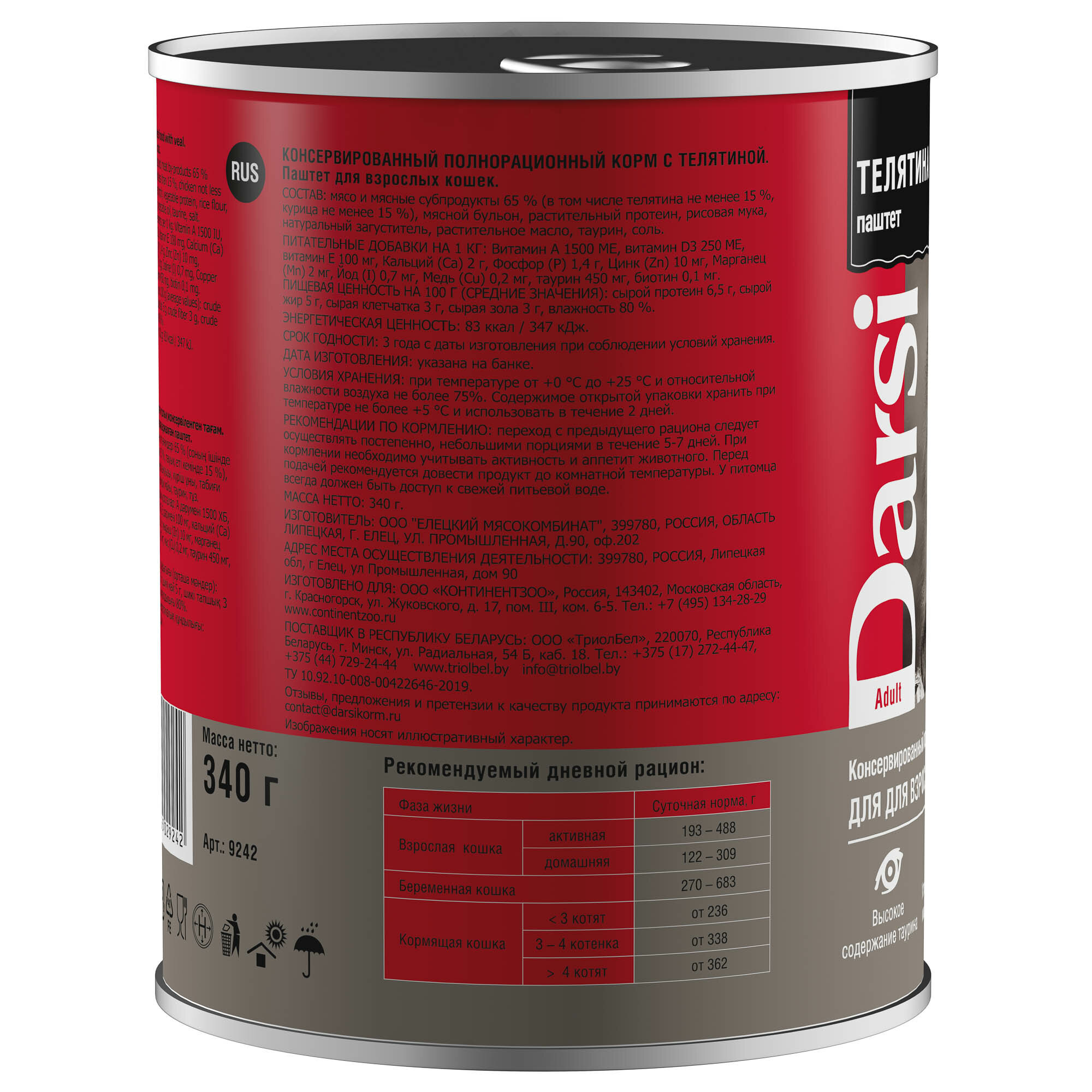 Корм Darsi (паштет) для взрослых кошек "Телятина", 340 г x 12 шт